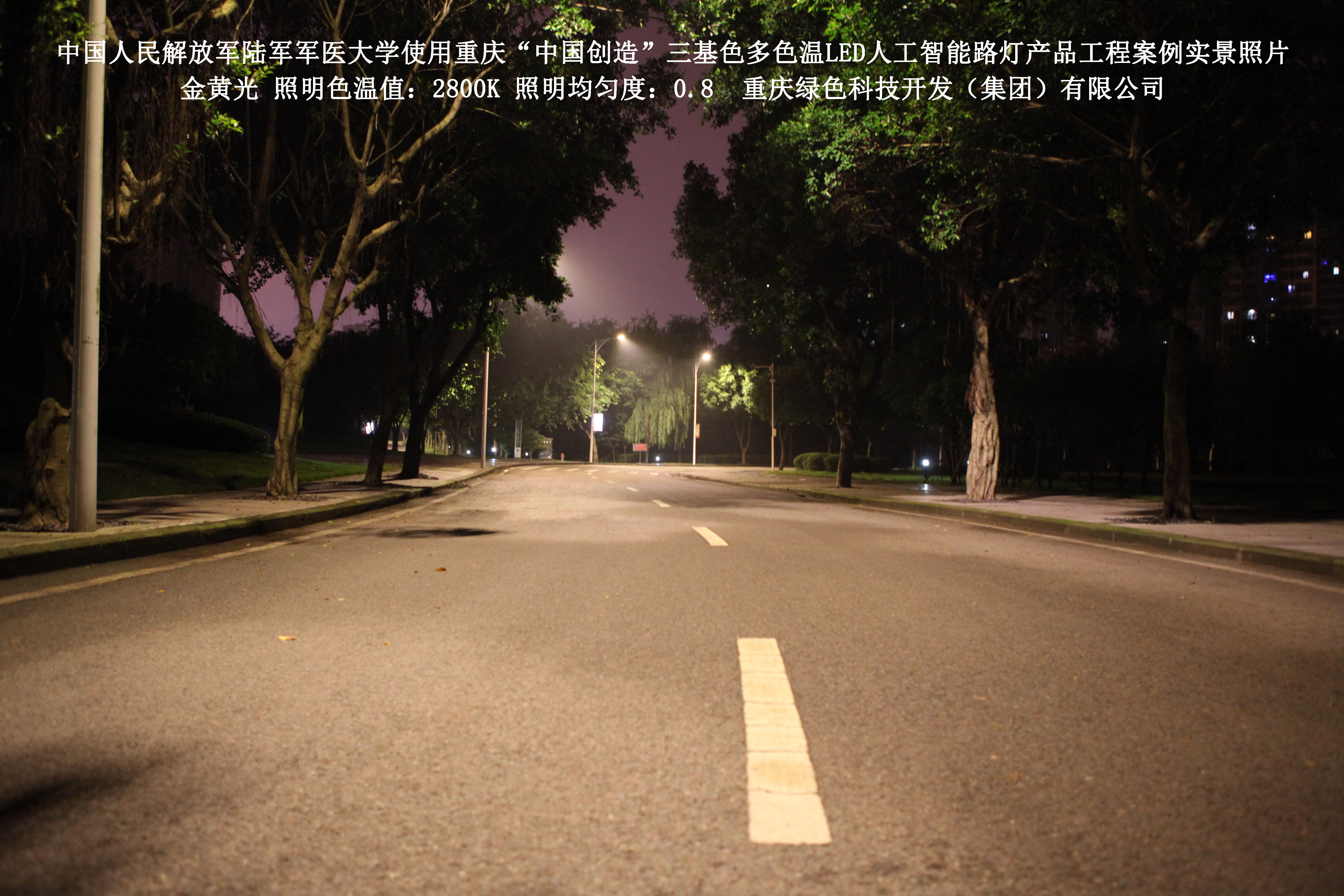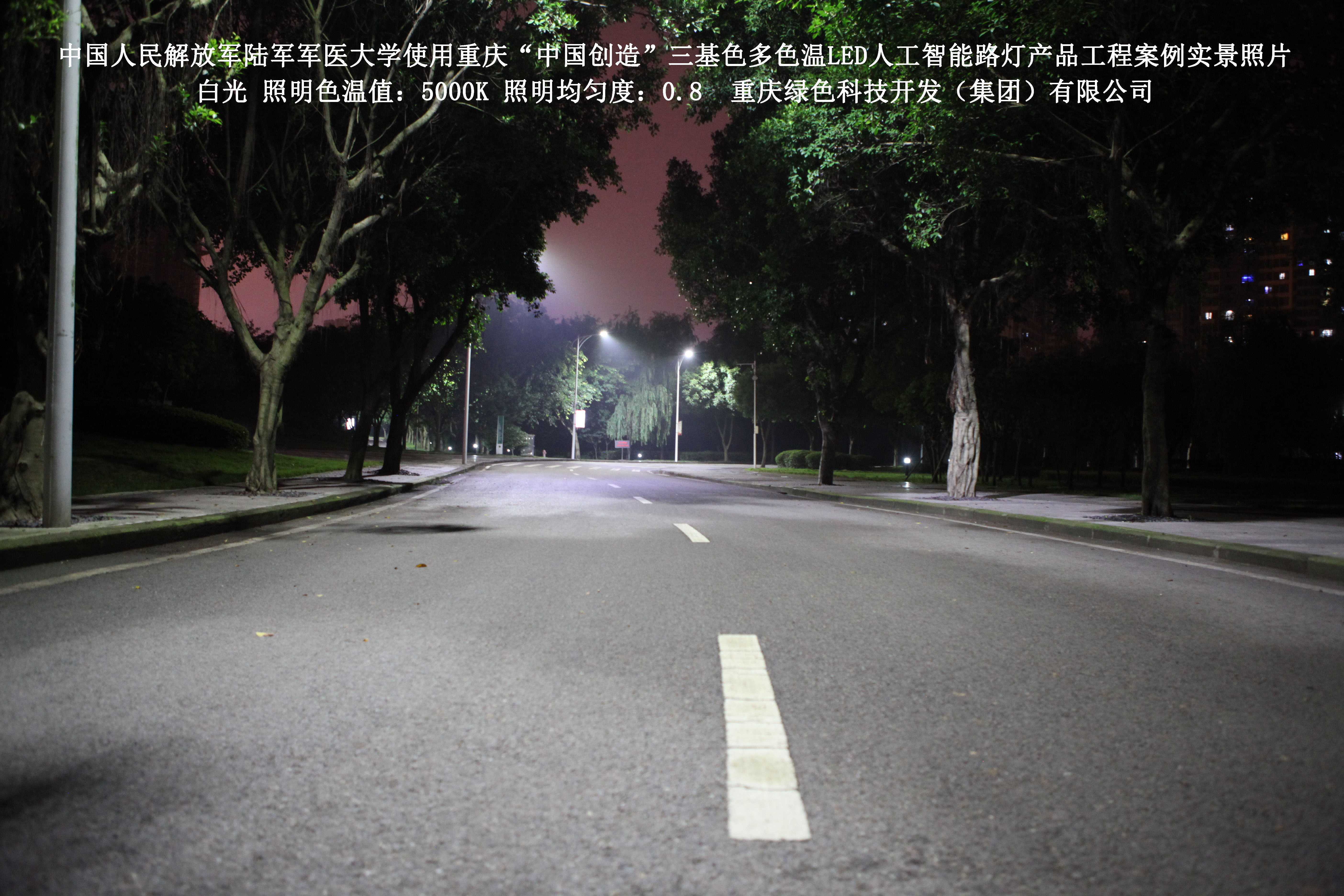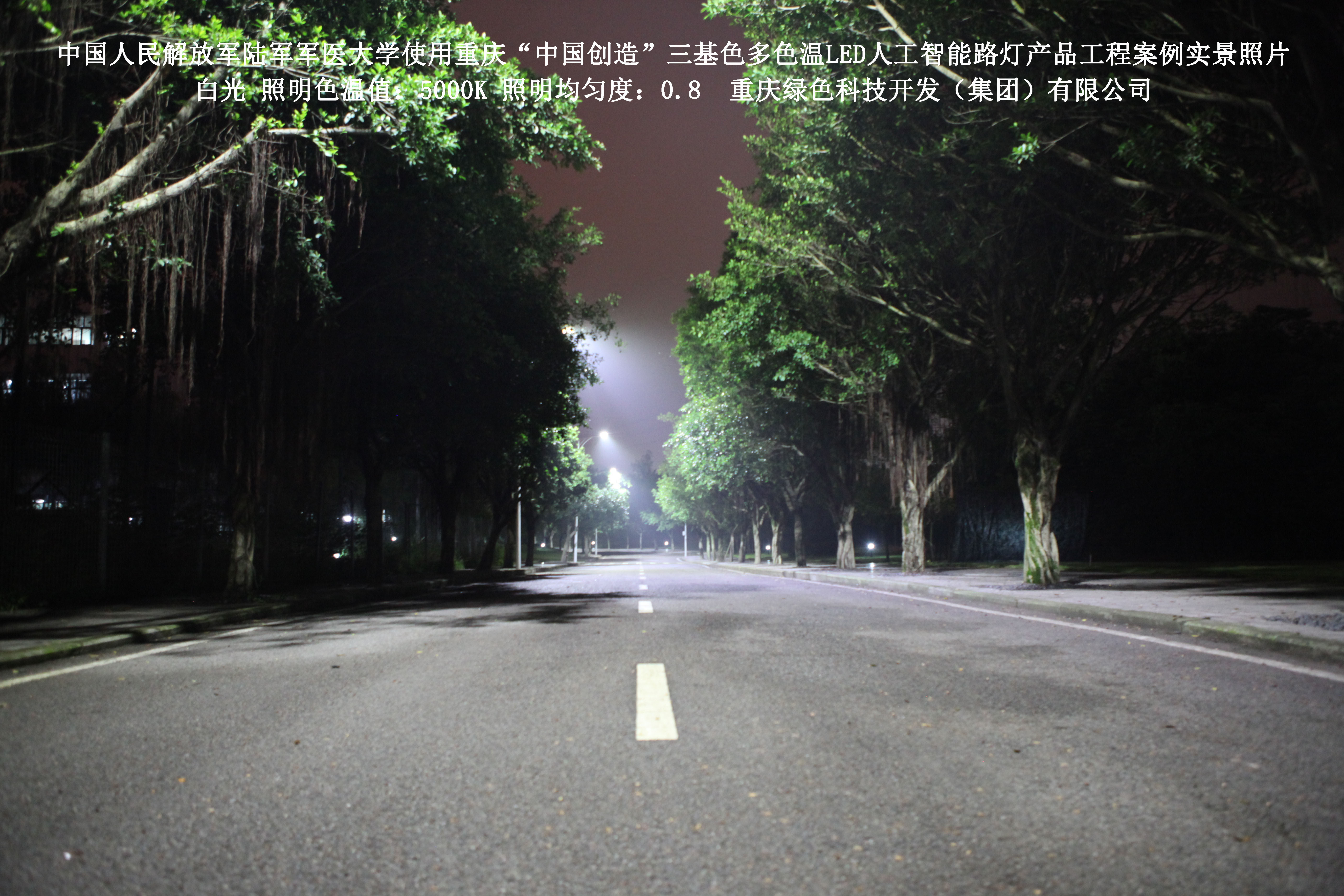 2018年4月,中國(guó)人民解放軍陸軍軍醫(yī)大學(xué)使用了我司研發(fā)制造的重慶“中國(guó)創(chuàng)造”三基色多色溫LED人工智能路燈,對(duì)沙坪壩大學(xué)城校區(qū)道路實(shí)施了綠色照明科技節(jié)能改造工程,該工程已全面竣工。工程實(shí)施后,極大地提高了照明清晰度、燈光均勻度、舒適度,實(shí)現(xiàn)城市路燈照明系統(tǒng)的智能化管理。