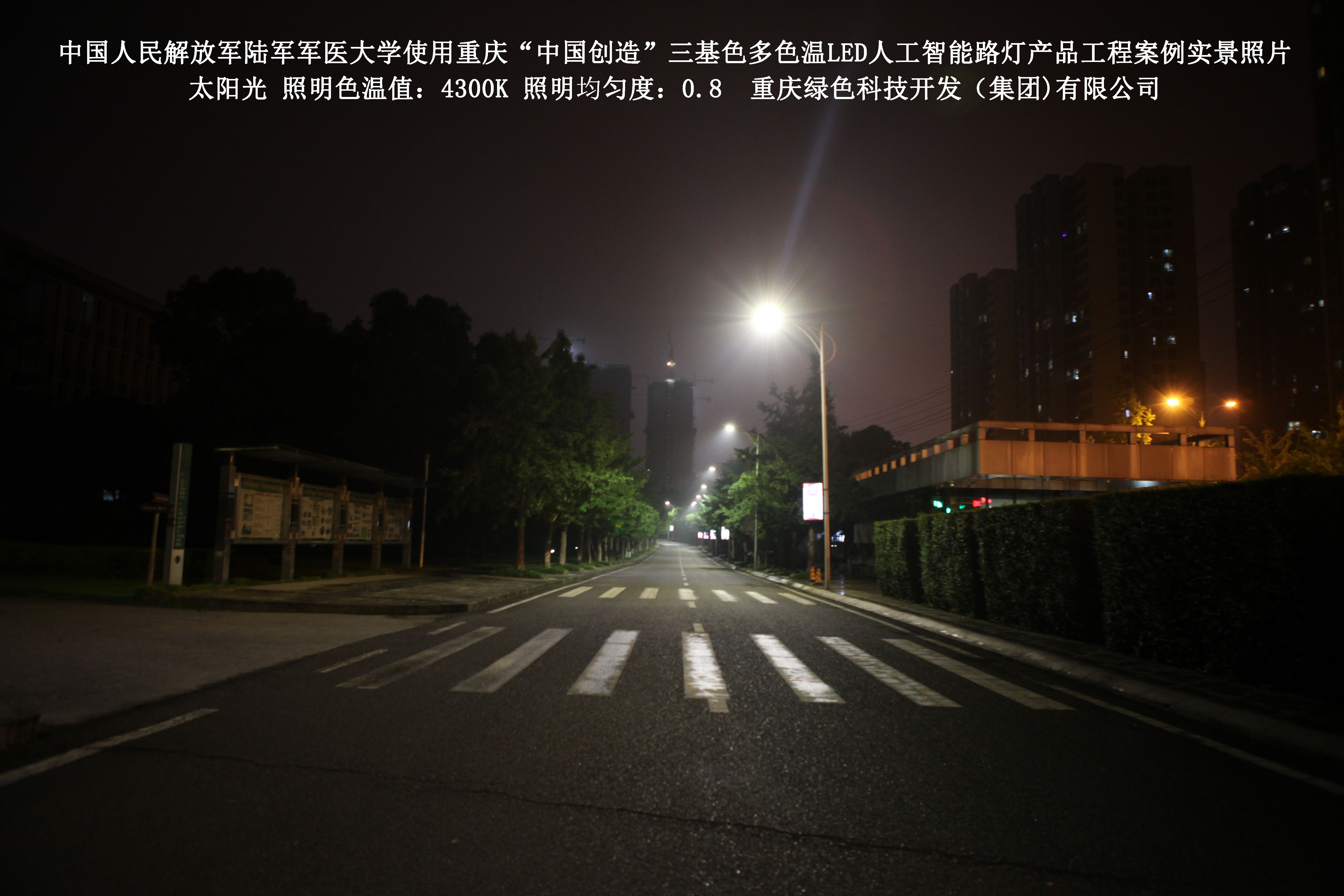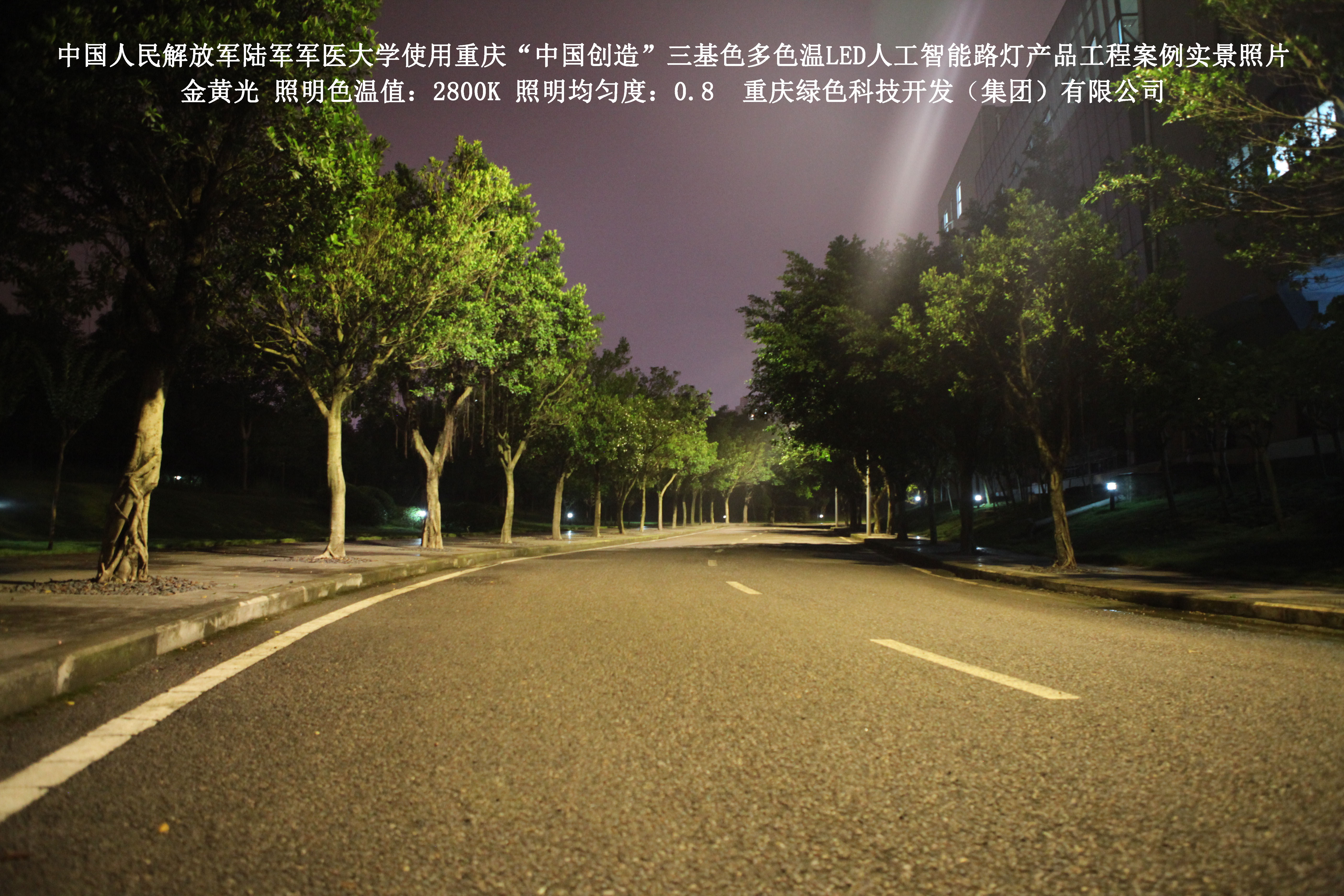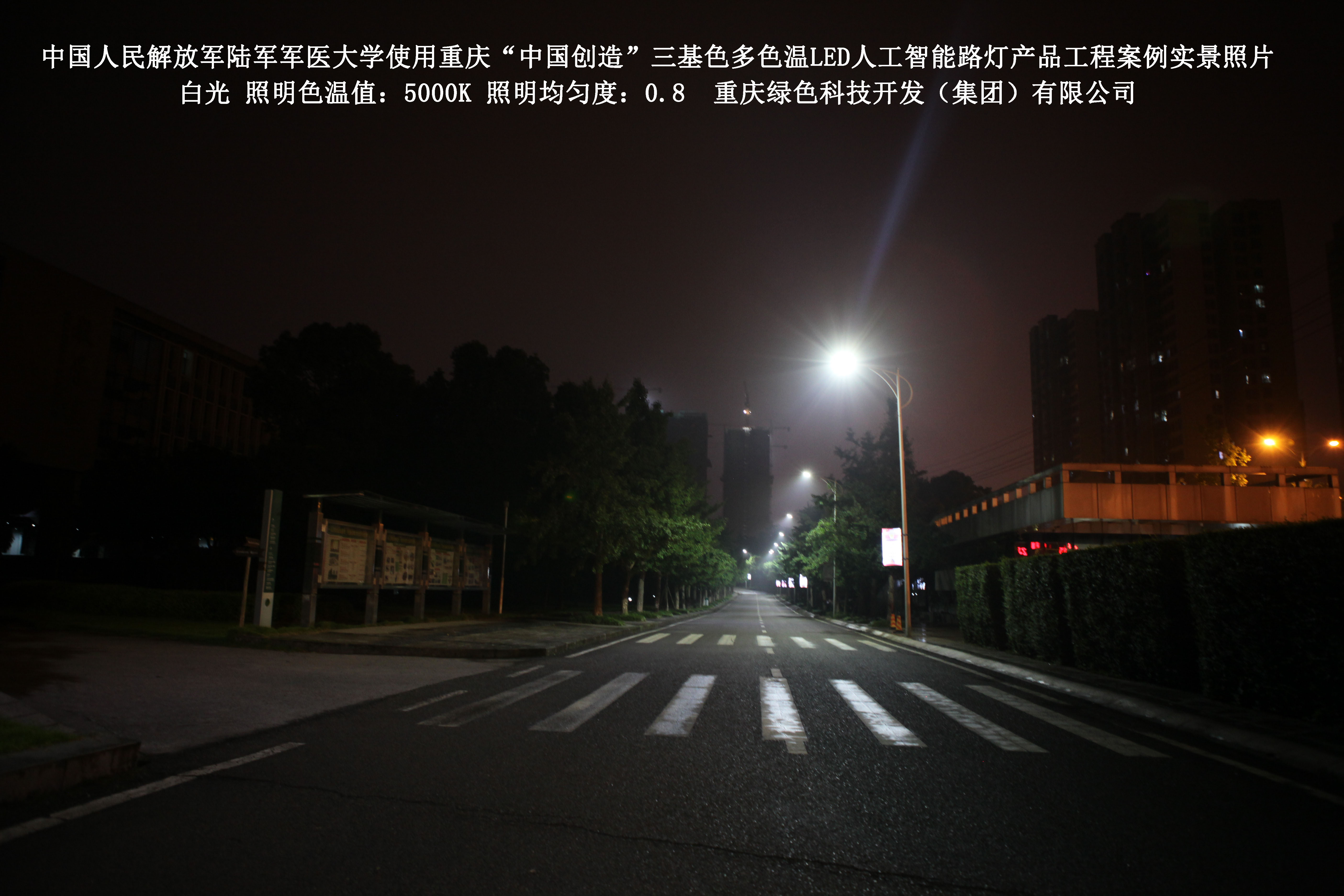 2018年4月,中國(guó)人民解放軍陸軍軍醫(yī)大學(xué)使用了我司研發(fā)制造的重慶“中國(guó)創(chuàng)造”三基色多色溫LED人工智能路燈,對(duì)沙坪壩大學(xué)城校區(qū)道路實(shí)施了綠色照明科技節(jié)能改造工程,該工程已全面竣工。工程實(shí)施后,極大地提高了照明清晰度、燈光均勻度、舒適度,實(shí)現(xiàn)城市路燈照明系統(tǒng)的智能化管理。