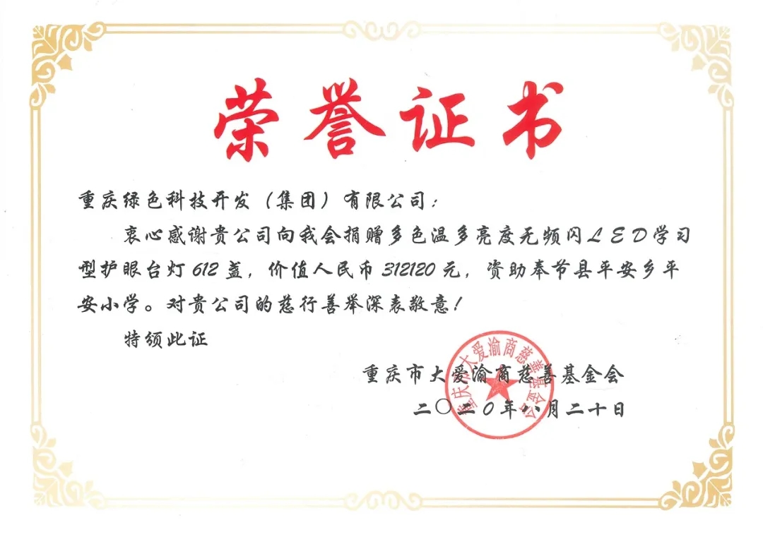 2020年8月5日,重慶綠色科技開發(fā)(集團(tuán))有限公司支持國家級重點(diǎn)貧困縣精準(zhǔn)扶貧工作,通過重慶市大愛渝商慈善基金會,向奉節(jié)縣平安鄉(xiāng)平安小學(xué)捐贈多色溫多亮度無頻閃LED學(xué)習(xí)型護(hù)眼臺燈612盞、太陽能智慧燈桿4套,總價值36.2萬元的愛心物資,助力脫貧攻堅。